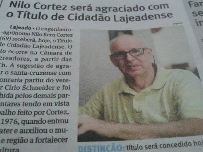 Ao contrário do que foi divulgado anteriormente em alguns veículos de comunicação, a Sessão Solene para entrega do Título de Cidadão Lajeadense ao Sr.Nilo Kern Cortez, será realizada nesta sexta-feira (08/04), a partir das 18h, no plenário da Câmara Municipal de Lajeado.