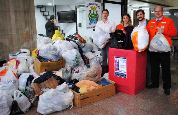 Na tarde desta quinta-feira (11/06), o presidente do Legislativo, Carlos Eduardo Ranzi (PMDB), juntamente com o vereador Heitor Hoppe (PT), realizou a primeira entrega dos donativos arrecadados na Campanha do Agasalho 2015 – Aquecendo a Cidade com Solidariedade.