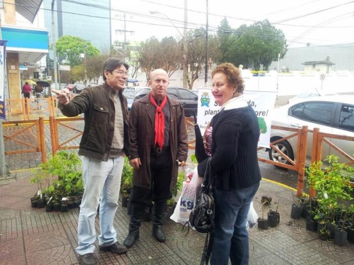 Dezenas de mudas frutíferas foram distribuídas aos transeuntes nas proximidades do supermercado IMEC da Rua Julio de Castilhos, no Centro de Lajeado.