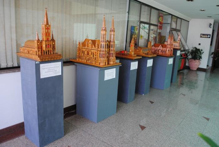 São seis réplicas de templos da região dos vales, entre os quais, a da Igreja São Sebastião Mártir, de Venâncio Aires, expostas no saguão da Câmara.
