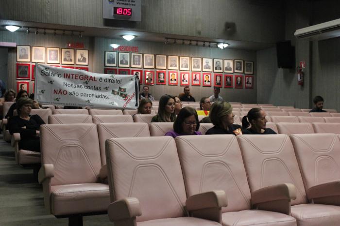 Manifesto contra o parcelamento dos salários dos professores pelo 8º Núcleo Cpers na 39ª Sessão Ordinária. Com uso da tribuna, Gerson Johann e Gilson dos Anjos fizeram um apelo aos vereadores, para que estes solicitem também aos seus deputados apoio pela causa.