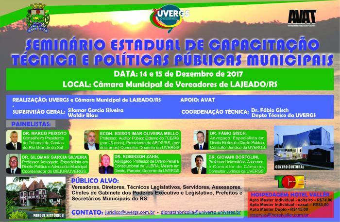 A Câmara de Vereadores de Lajeado sedia em dezembro o Seminário Estadual de Capacitação Técnica e Políticas Públicas Municipais. O seminário é uma realização da câmara e Uvergs, com apoio da Avat. É uma oportunidade de aperfeiçoamento para aqueles que já atuam em cargos públicos e de capacitação para iniciantes nas funções.