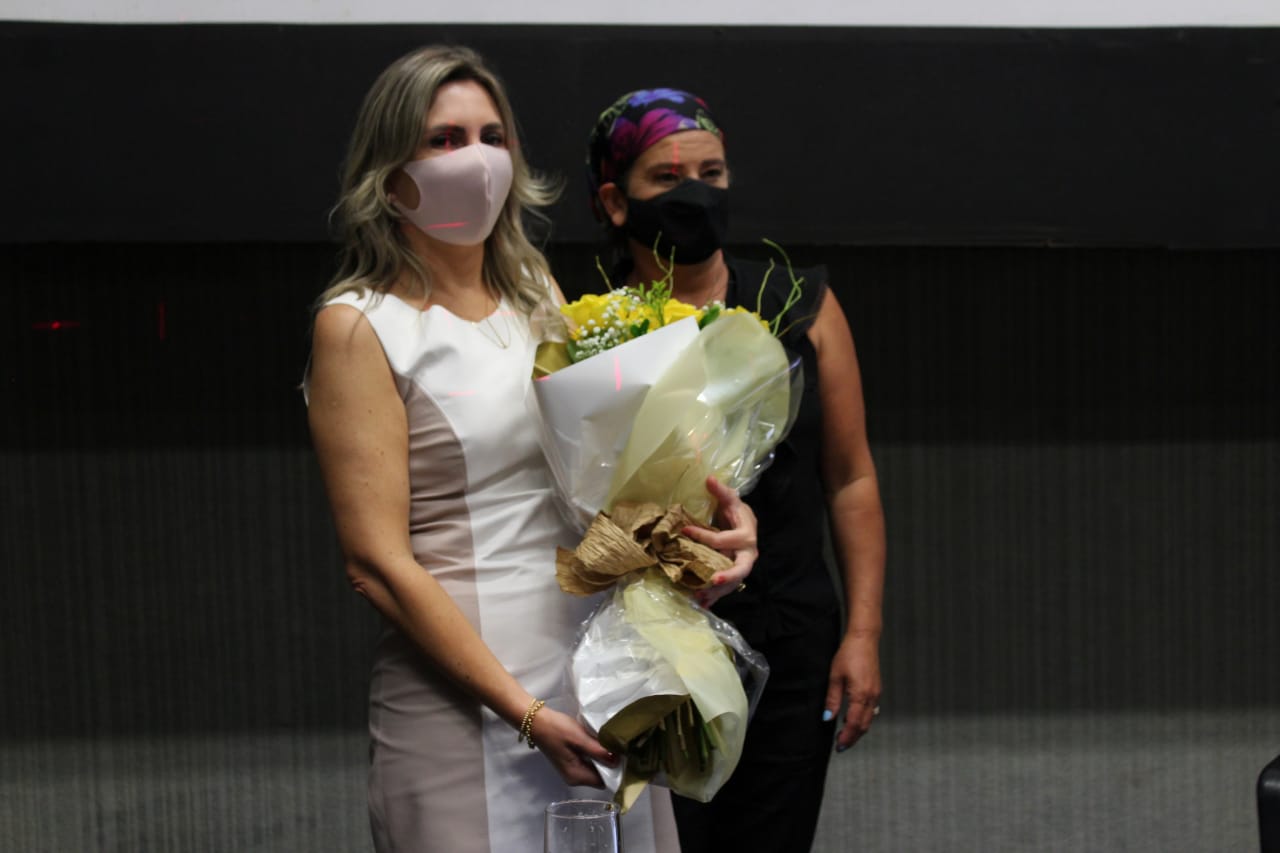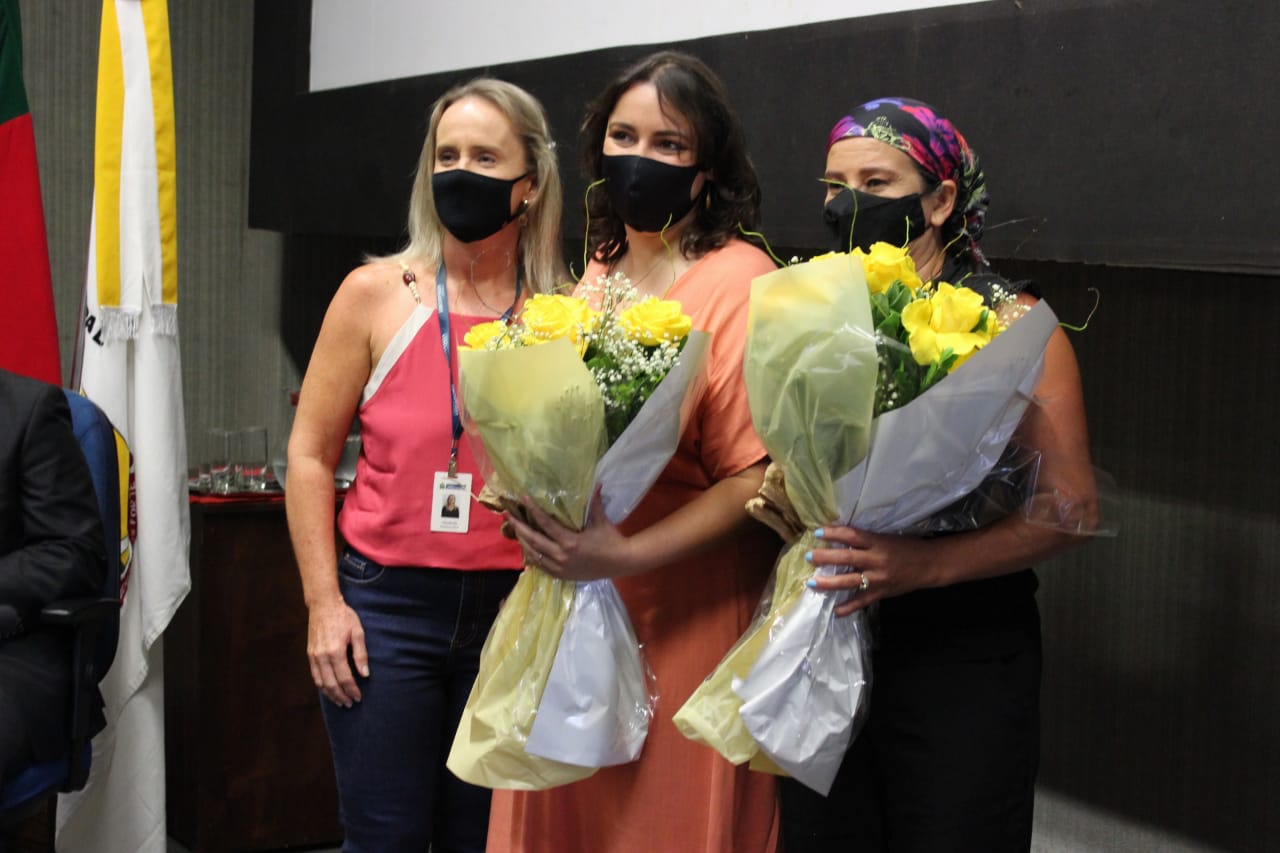 As vereadoras empossadas, Paula Thomas (PSDB) e Ana da Apama (MDB), bem como a vice-prefeita, Gláucia Schumacher (PP) e a primeira-dama Aline Scapini Caumo, receberam flores da Câmara Municipal de Lajeado.
