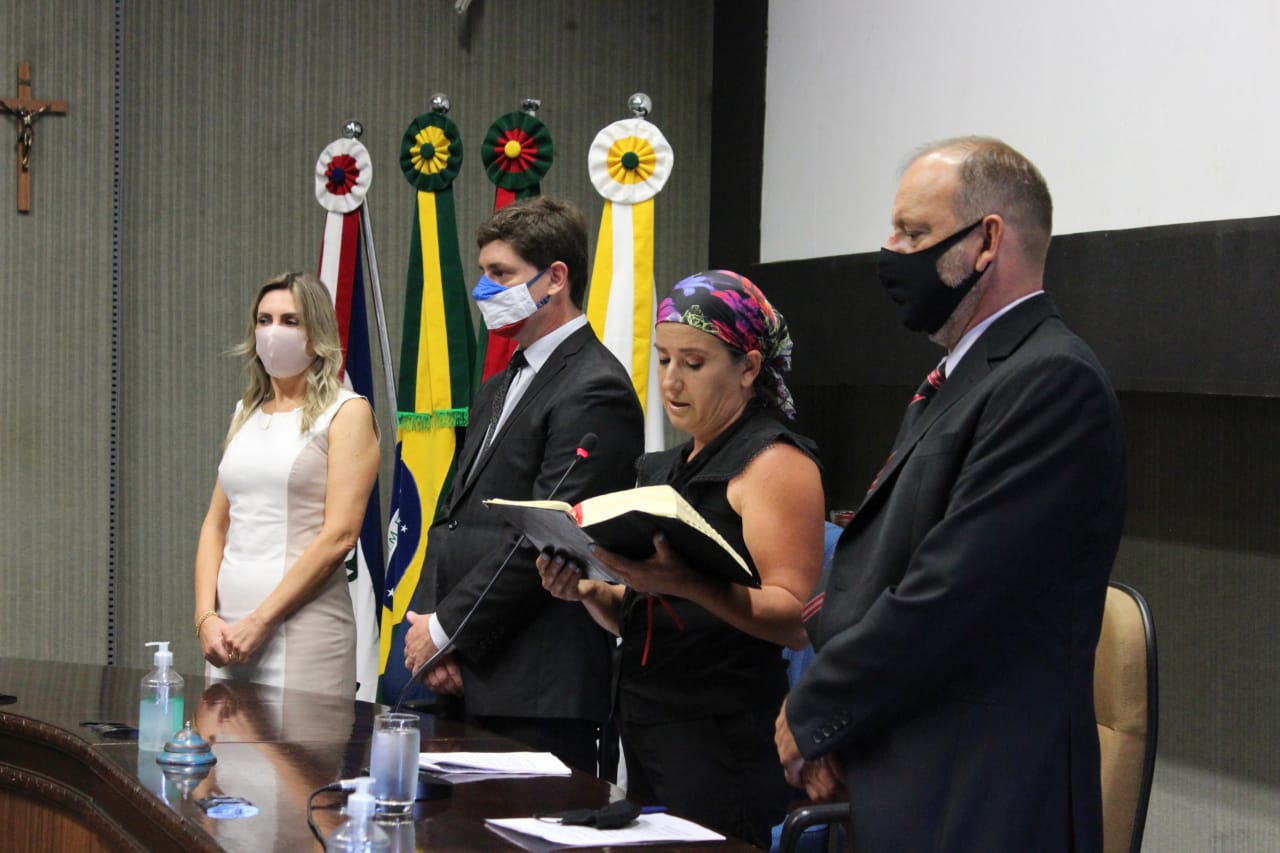Na sequência, o prefeito e a vice prestaram o compromisso legal, e foram declarados empossados pela vereadora que conduzia os trabalhos, Ana da Apama (MDB). Vereadores representantes de cada bancada, Deoli Gräff (PP), Paula Thomas (PSDB), Sérgio Kniphoff (PT) e Carlos Eduardo Ranzi (MDB) fizeram uso da palavra, em nome dos colegas de partido. O atual presidente da Casa, Lorival Ewerling dos Santos Silveira (PP) também manifestou-se, bem como o prefeito Marcelo Caumo (PP).