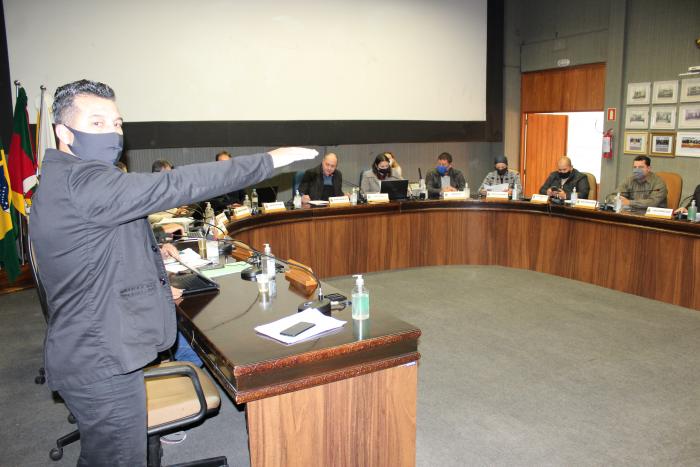 Logo após a abertura da Sessão Plenária desta terça-feira (03/08), o presidente da Câmara, Isidoro Fornari (PP), deu posse ao novo integrante da Casa. O Suplente de Vereador, Oilquer João Soares dos Santos (Neco), do Partido da Social Democracia Brasileira (PSDB), prestou juramento e assumirá por quinze dias a vaga do titular Marcio Dal Cin (PSDB), afastado para tratar de interesse particular.
