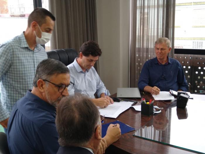 Nesta sexta-feira (11/03), os membros da Mesa Diretora do Poder Legislativo, presidente Deoli Graff (PP), vice-presidente Paula Thomas (PSDB) e secretário Alex Schmitt (PP), estiveram no gabinete do prefeito Marcelo Caumo, para a assinatura da escritura de doação de área do Município para o Serviço Social do Transporte e Serviço Nacional de Aprendizagem do Transporte (SEST/SENAT).