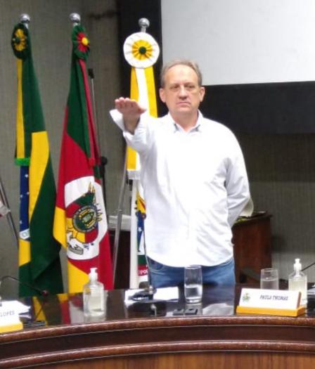 Logo após a abertura da sessão plenária o presidente da Câmara, Deoli Graff (PP), deu posse ao suplente de vereador, Sérgio Rambo (PT). Ele prestou juramento e assumiu por três dias a vaga do vereador titular Sérgio Kaniphoff (PT), afastado para tratamento de saúde.