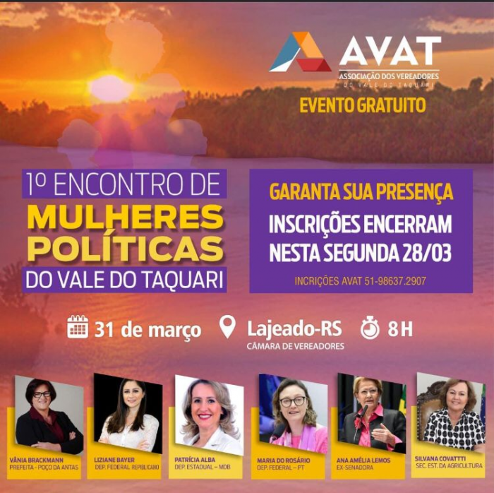 O plenário da Câmara de Vereadores de Lajeado irá sediar nesta quinta-feira (31/03), a partir das 08h45min, o 1º Encontro de Mulheres Políticas do Vale do Taquari, promovido pela Associação de Vereadores do Vale do Taquari, através da Coordenadoria da Mulher.