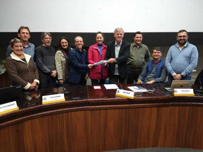 O secretário Municipal da Fazenda, Rafael Spengler, acompanhado da contadora, Lisane Koch Stoll, entregou ao presidente da Câmara Municipal de Lajeado, vereador Deolí Gräff (PP), o Projeto de Lei de Diretrizes Orçamentárias (LDO) 2023 nesta terça-feira (30/08), pouco antes do início da sessão.