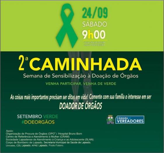 Visando a conscientização da população sobre a importância da doação de órgãos, a Câmara Municipal de Vereadores de Lajeado realiza, neste sábado, dia 24 de setembro, a II Caminhada pela Vida. O evento faz parte da programação da “Semana de Sensibilização à Doação de Órgãos e Tecidos e Construção da Cultura Doadora”, que ocorre entre os dias 24 e 30 de setembro.