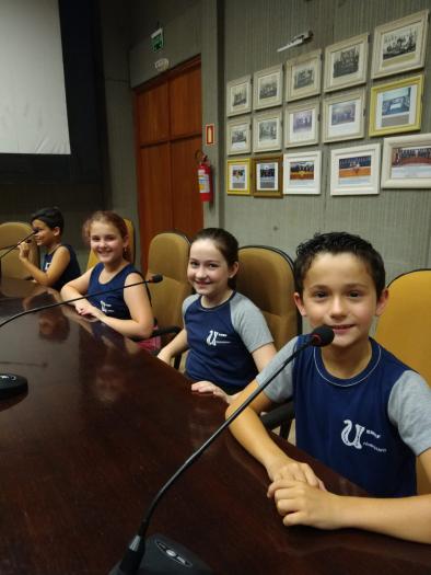 Durante a visita, os estudantes tiveram a experiência de ocupar as cadeiras dos parlamentares falar ao microfone simulando uma sessão plenária.