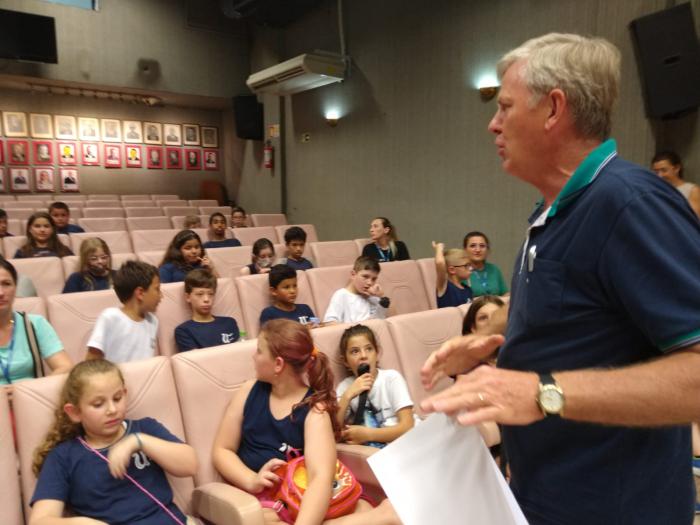 Presidente, vereador Deolí Graff (PP), falou um pouco de como funciona o parlamento e responderam algumas perguntas dos alunos.