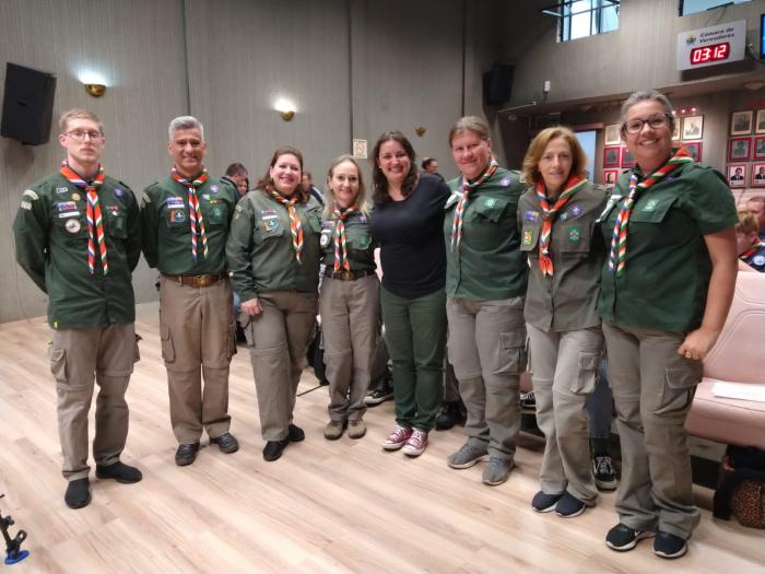 Na sessão desta terça-feira (25/04), na Câmara de Lajeado, a Tribuna Livre foi ocupada pela presidente do Grupo de Escoteiros Tibiquary, Jorgeana Lorenzetti, que fez seu pronunciamento em homenagem ao Dia Mundial do Escoteiro.