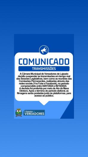 A Câmara Municipal de Vereadores de Lajeado decidiu suspender as transmissões em tempo real das sessões legislativas, bem como as reuniões das comissões permanentes, realizadas através das redes sociais (YouTube e Facebook), no período compreendido entre 04/07/2024 e 06/10/2024. A decisão foi proferida por meio de Ato da Mesa Diretora. Após o término do período eleitoral, as filmagens serão postadas junto às plataformas, para acesso ao público.