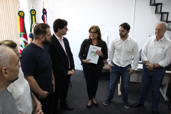 O prefeito Marcelo Caumo, o secretário de Planejamento, Rafael Zanatta e representantes do Sinduscon, Seavat e Fórum das Entidades estiveram, na manhã desta terça-feira, dia 9, na Câmara de Vereadores. A presidente Neca Dalmoro (PDT) recebeu a comitiva na Sala da Presidência Selvino Dalmoro e, na oportunidade, recebeu o Plano Diretor Lajeado 2040, por meio do projeto de lei 036/2019.