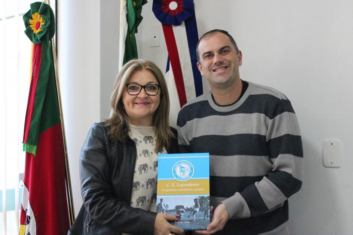 A presidente Neca Dalmoro (PDT) recebeu, na manhã desta quinta-feira, dia 22, na Sala da Presidência Selvino Dalmoro, a visita do comunicador Rodrigo Conte. Na ocasião, Conte entregou à Neca um exemplar do livro que conta a história do Lajeadense.