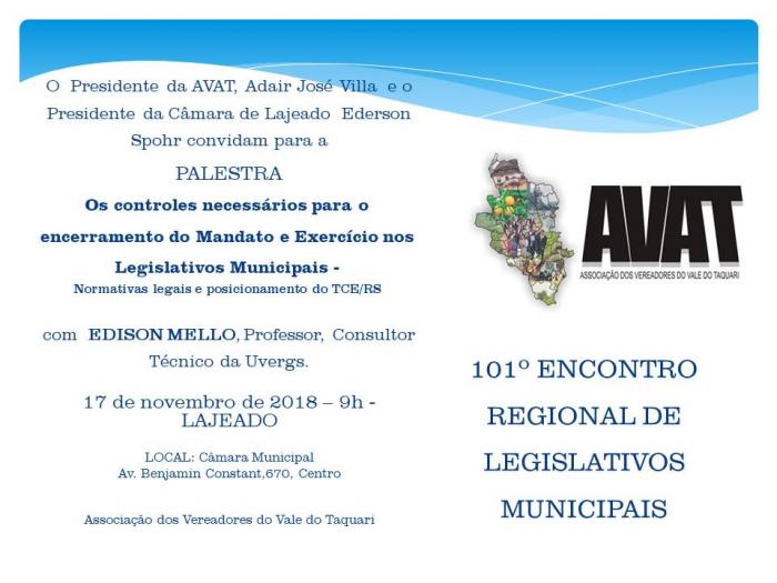 A Associação de Vereadores do Vale do Taquari (Avat) e a Câmara Municipal de Lajeado promovem, no dia 17 de novembro, o 101º Encontro Regional de Legislativos Municipais. O evento será realizado das 8h30min ao meio-dia, na Câmara de Lajeado. A sede está localizada na Avenida Benjamin Constant, 670, Centro.