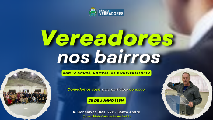 Projeto “Vereadores nos Bairros” promove encontro em 26 de junho, às 19h, na Comunidade Católica Santo André (Rua Gonçalves Dias, 222).